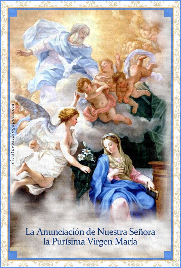 María respondió al Ángel: «¿Cómo será esto, puesto que no conozco varón?» El Ángel le respondió: «El Espíritu Santo vendrá sobre Ti y el Poder del Altísimo te cubrirá con su sombra; por eso el que ha de nacer será Santo y se le llamará Hijo de Dios. Mira, también Isabel, Tu pariente, ha concebido un hijo en su vejez y este es ya el sexto mes de la que se decía que era estéril, porque no hay nada imposible para Dios.» Dijo María: «He aquí la Esclava del Señor; hágase en Mí según tu palabra.» Y el Ángel, dejándola, se fue.»