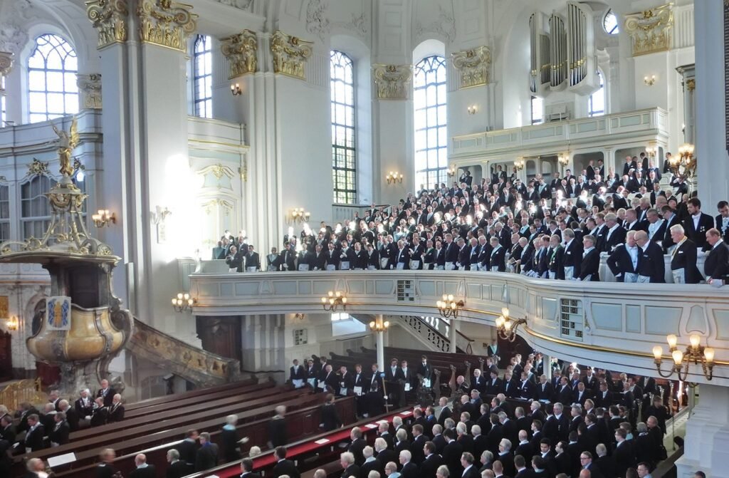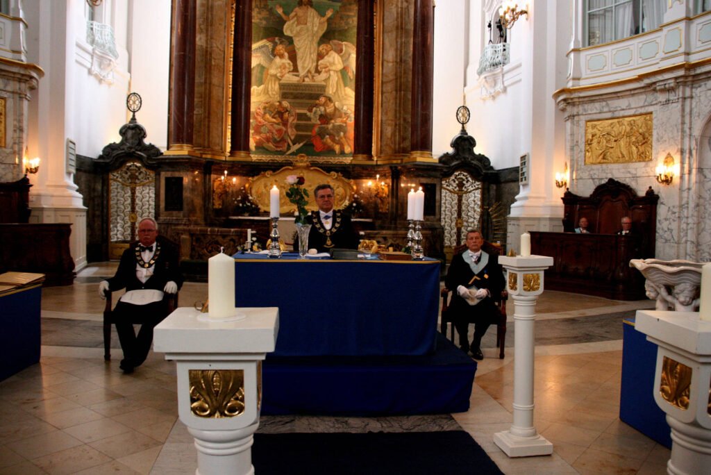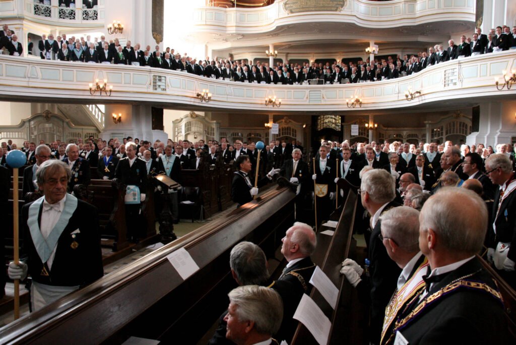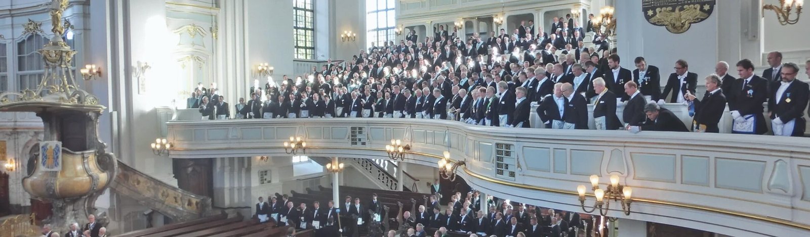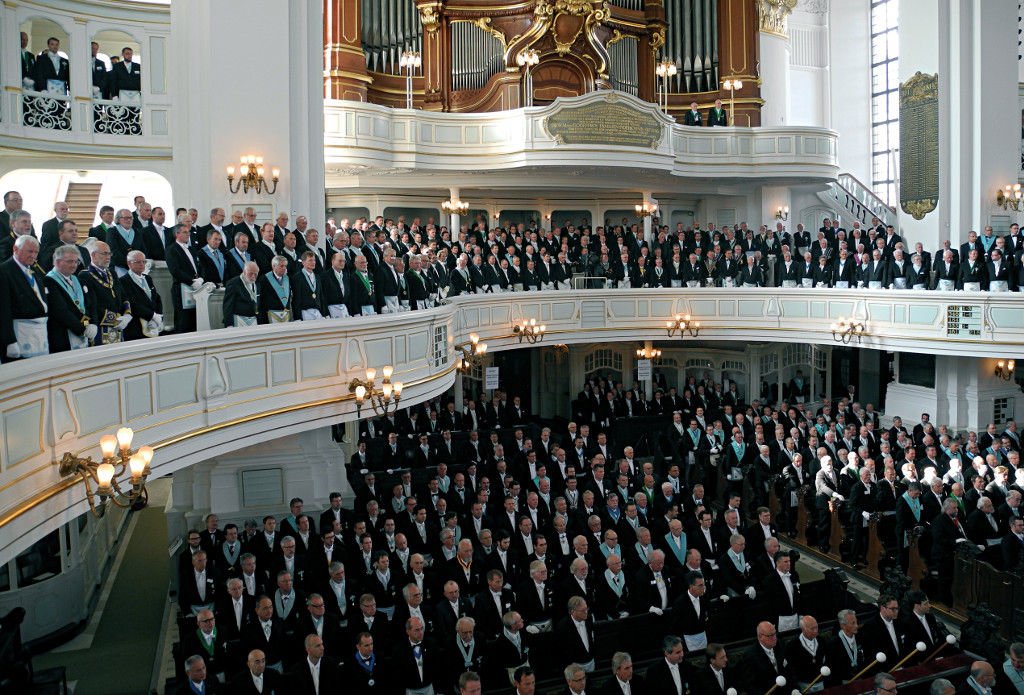 «1700 masones (…) entraron en la iglesia de San Miguel de Hamburgo. (…) La parroquia luterana accedió generosamente a la petición de las logias de Hamburgo de celebrar su ceremonia ritual en conmemoración de la fundación de la logia masónica alemana más antigua (…) en la iglesia principal de la ciudad.