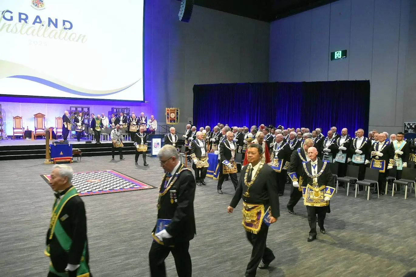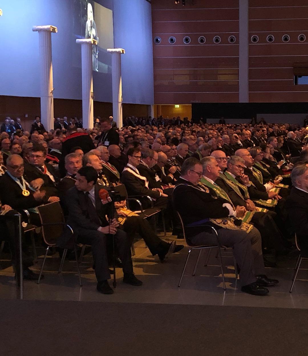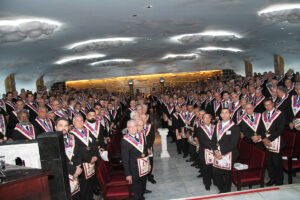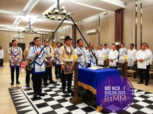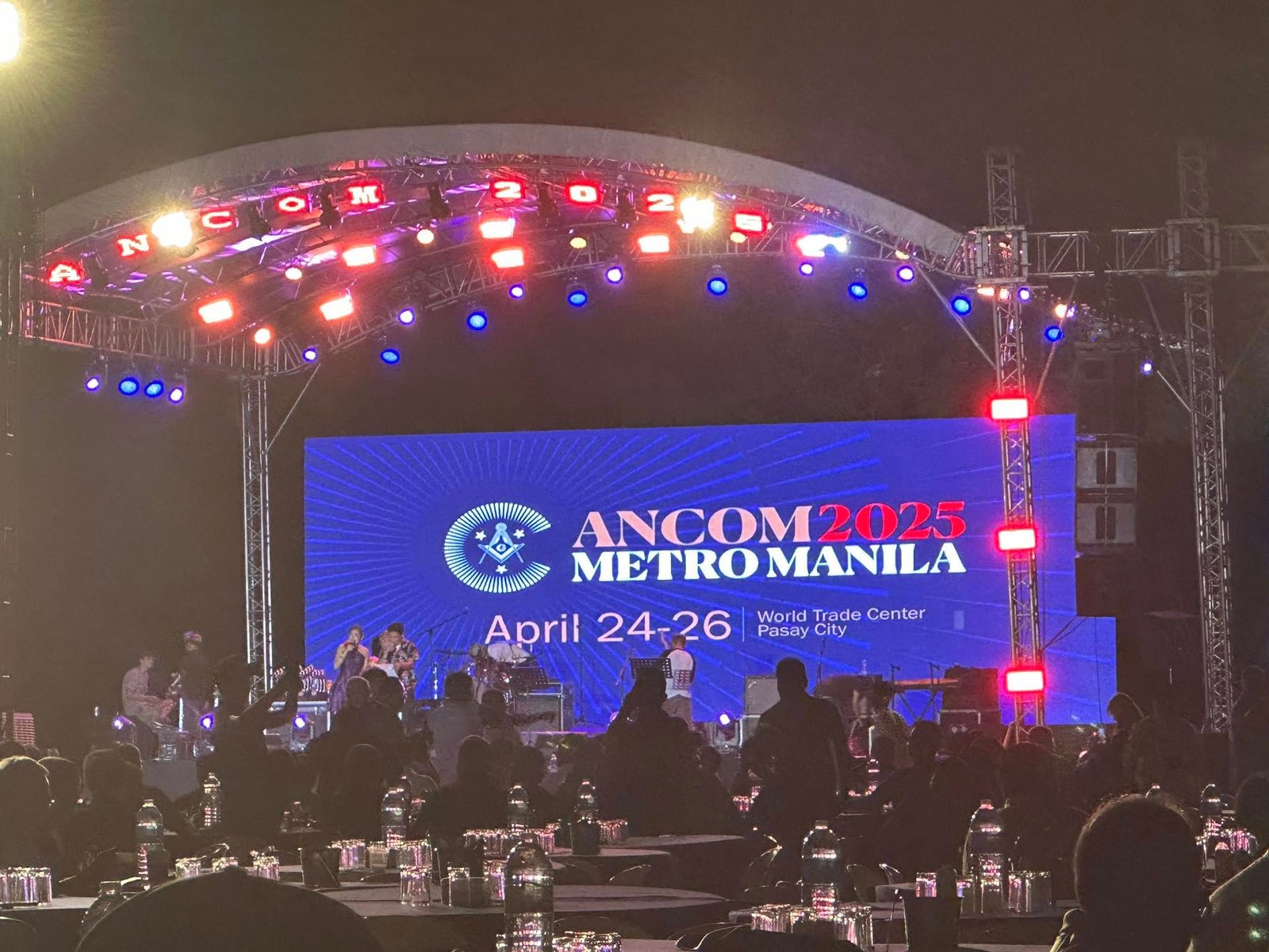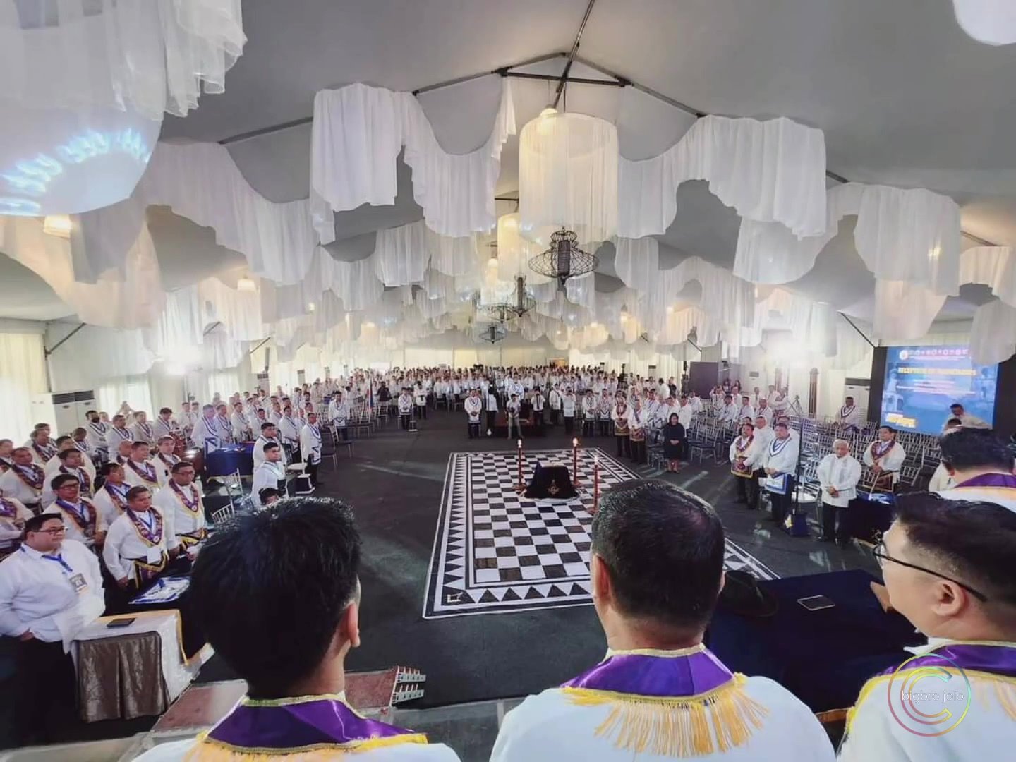 El siguiente ejemplo es del centro de convenciones «World Trade Center Metro Manila, in Pasay City». Se trata de una ceremonia de Instalación (reemplazo del Gran Maestre de la Gran Logia de Filipinas) del 107 ° Gran Maestre de Masones en la Jurisdicción de Filipinas, en abril de 2025, con concierto nocturno al aire libre. Normalmente tras la reuniones más o menos solemnes, grandes y pequeñas, suelen acabar en cena y celebración.