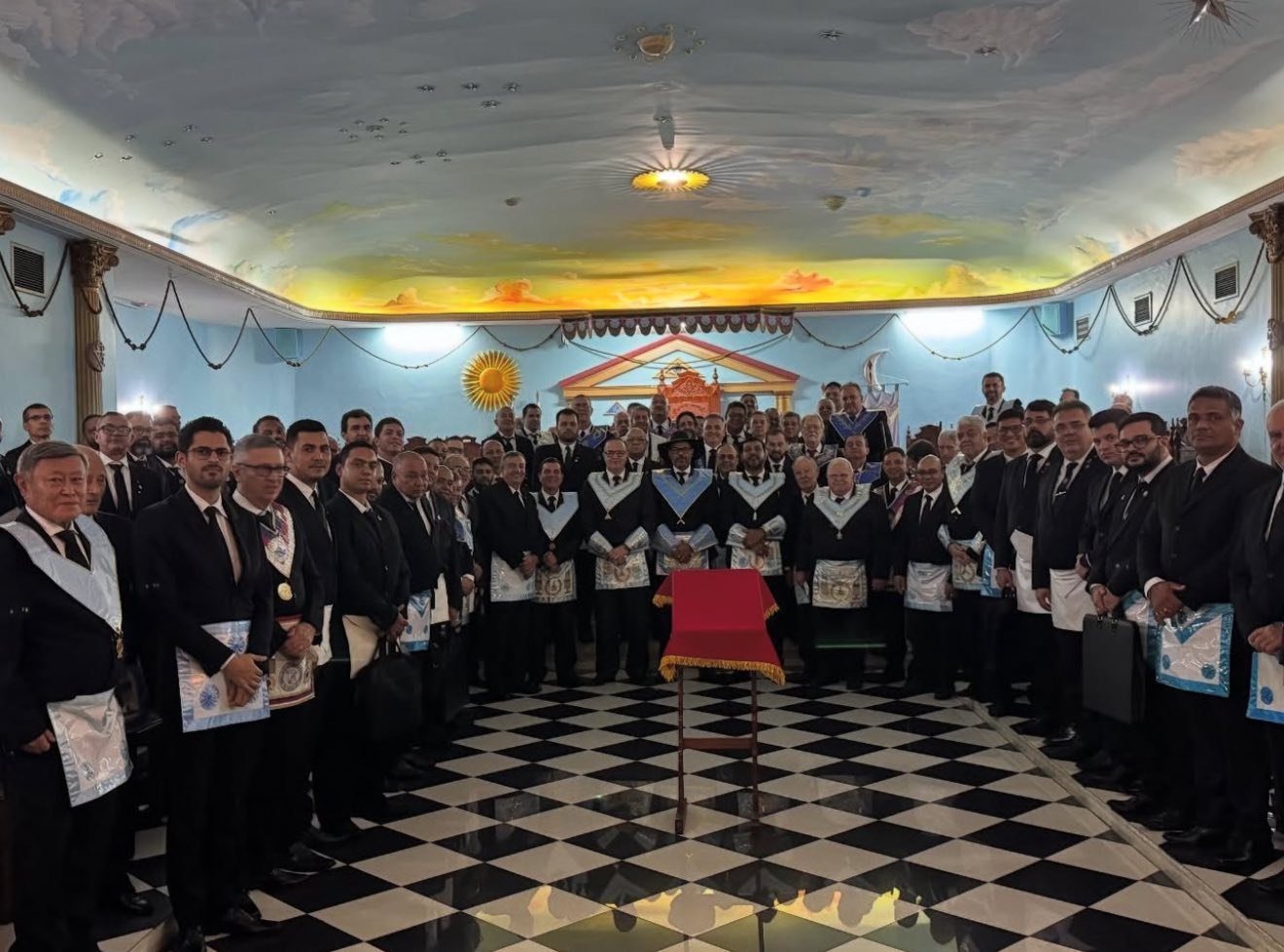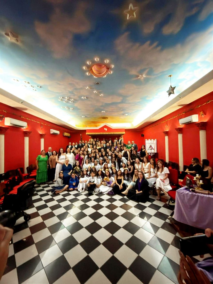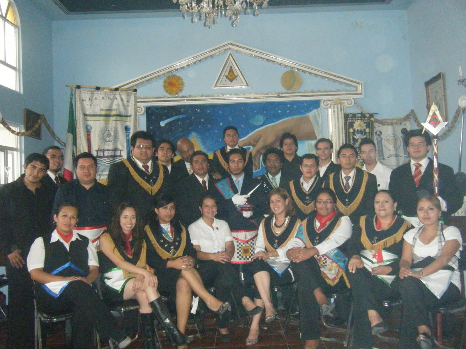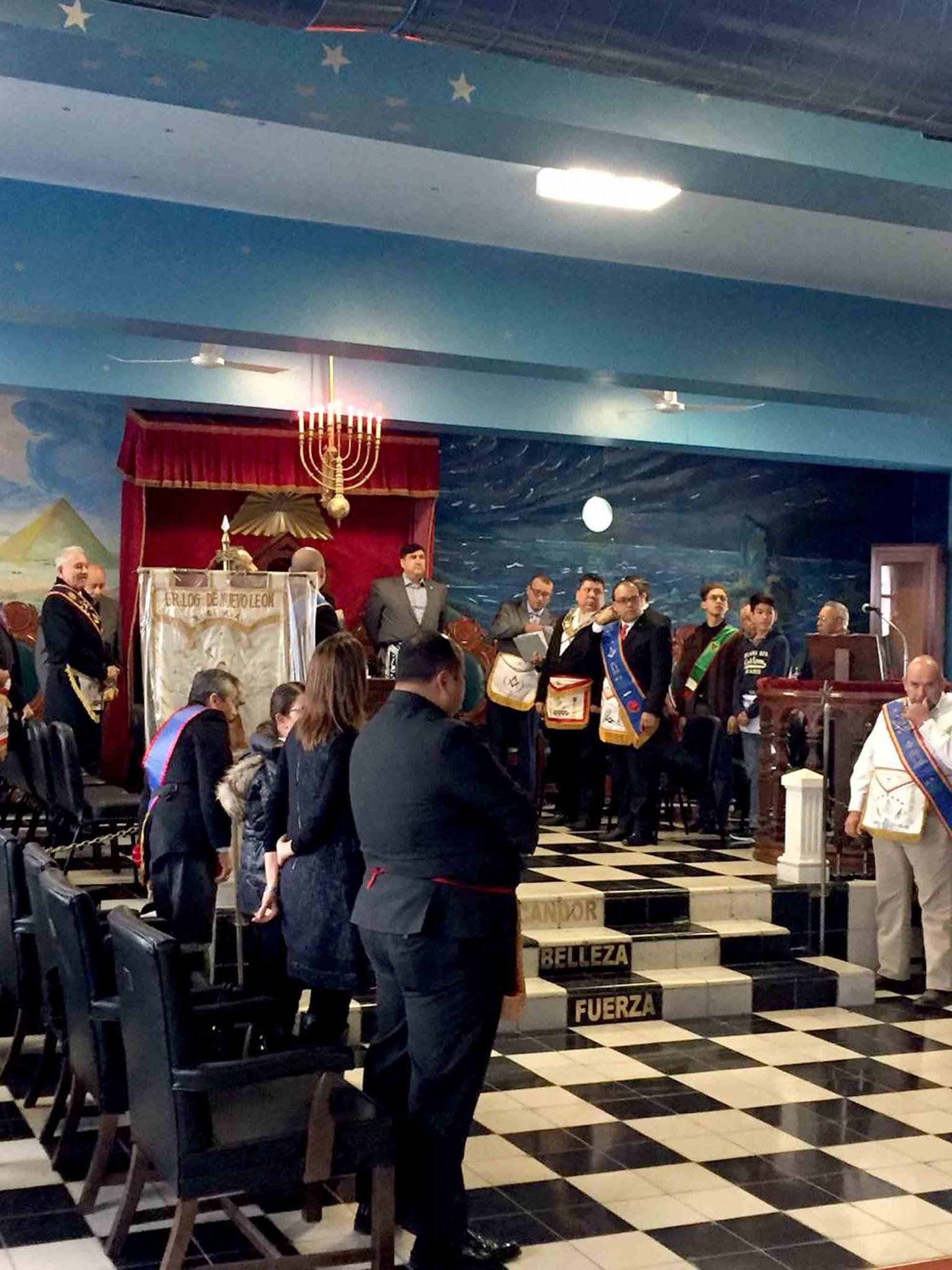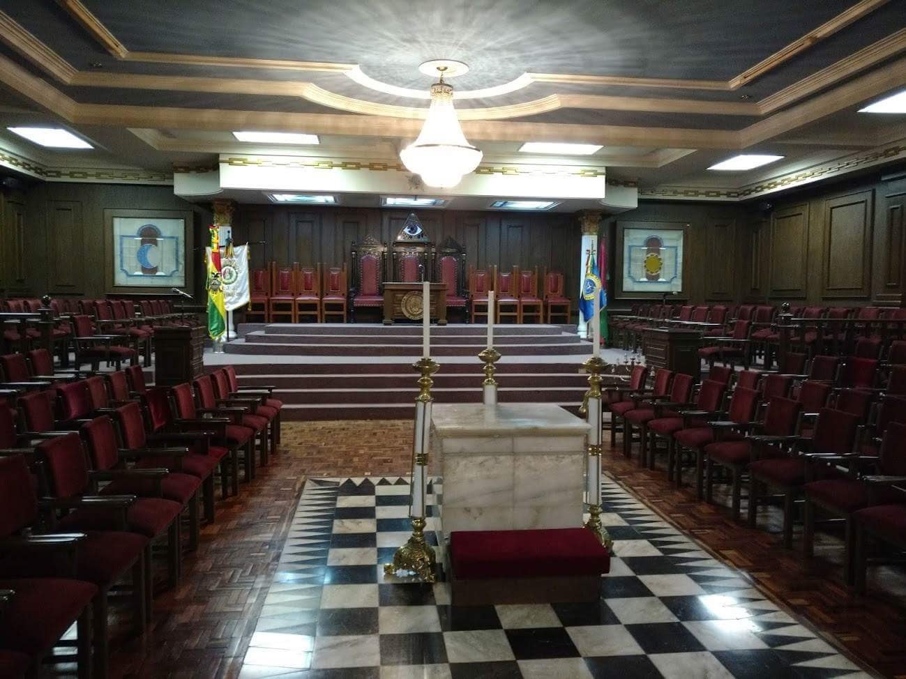 Nota: En las siguientes imágenes que verán del interior de las logias comprueben si ven alguna menorá o palabra del alfabeto hebreo decorando la sala