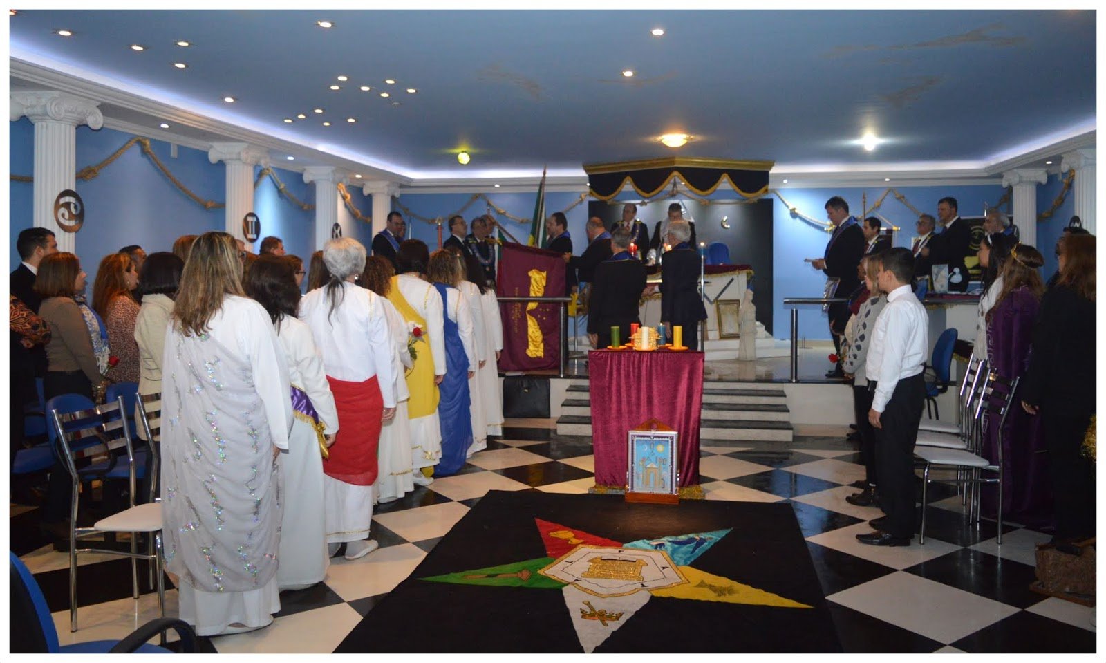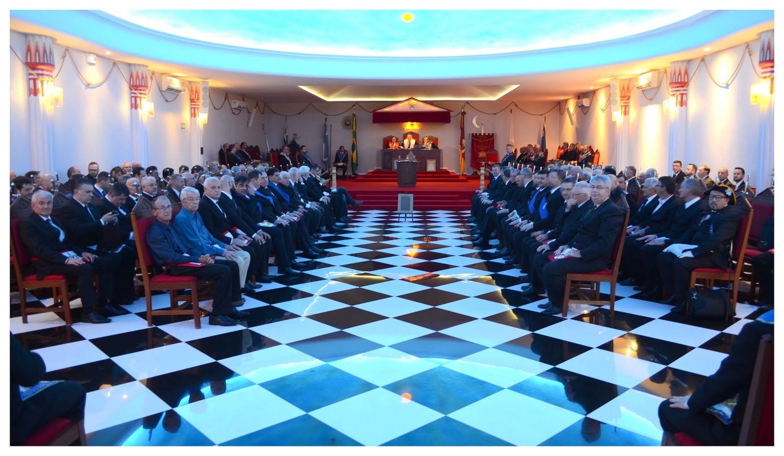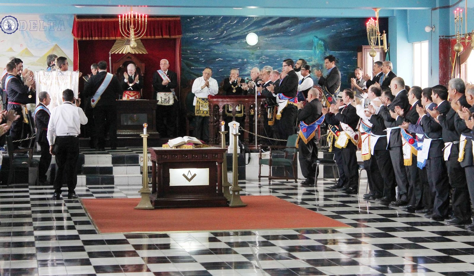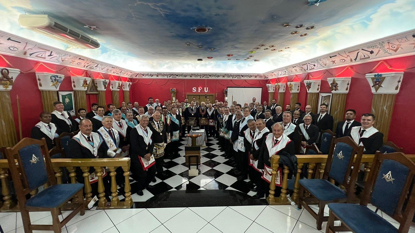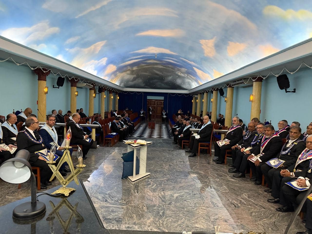 Nota: En las siguientes imágenes que verán del interior de las logias comprueben si ven alguna menorá o palabra del alfabeto hebreo decorando la sala