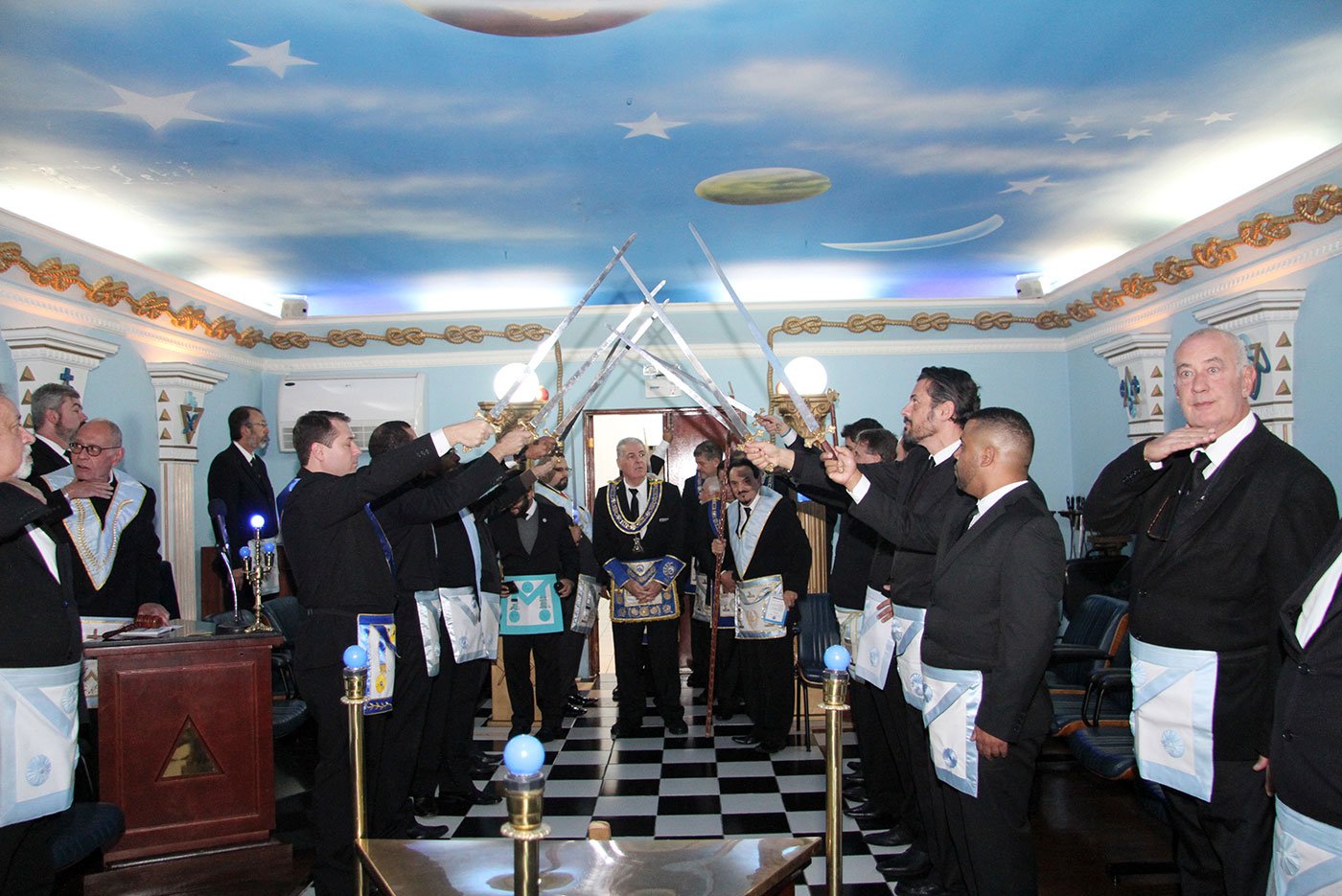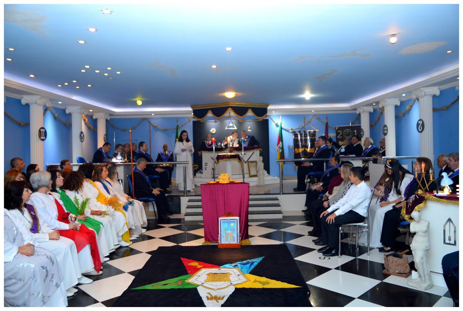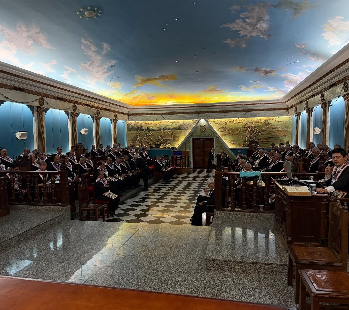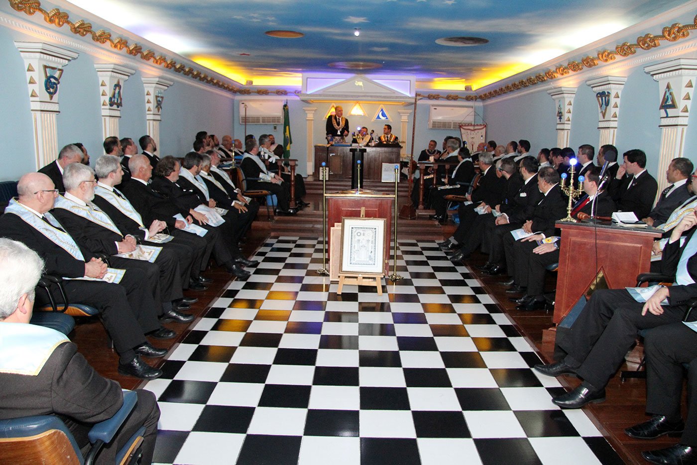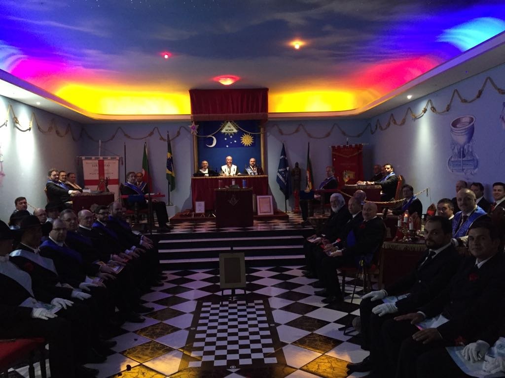 Nota: En las siguientes imágenes que verán del interior de las logias comprueben si ven alguna menorá o palabra del alfabeto hebreo decorando la sala