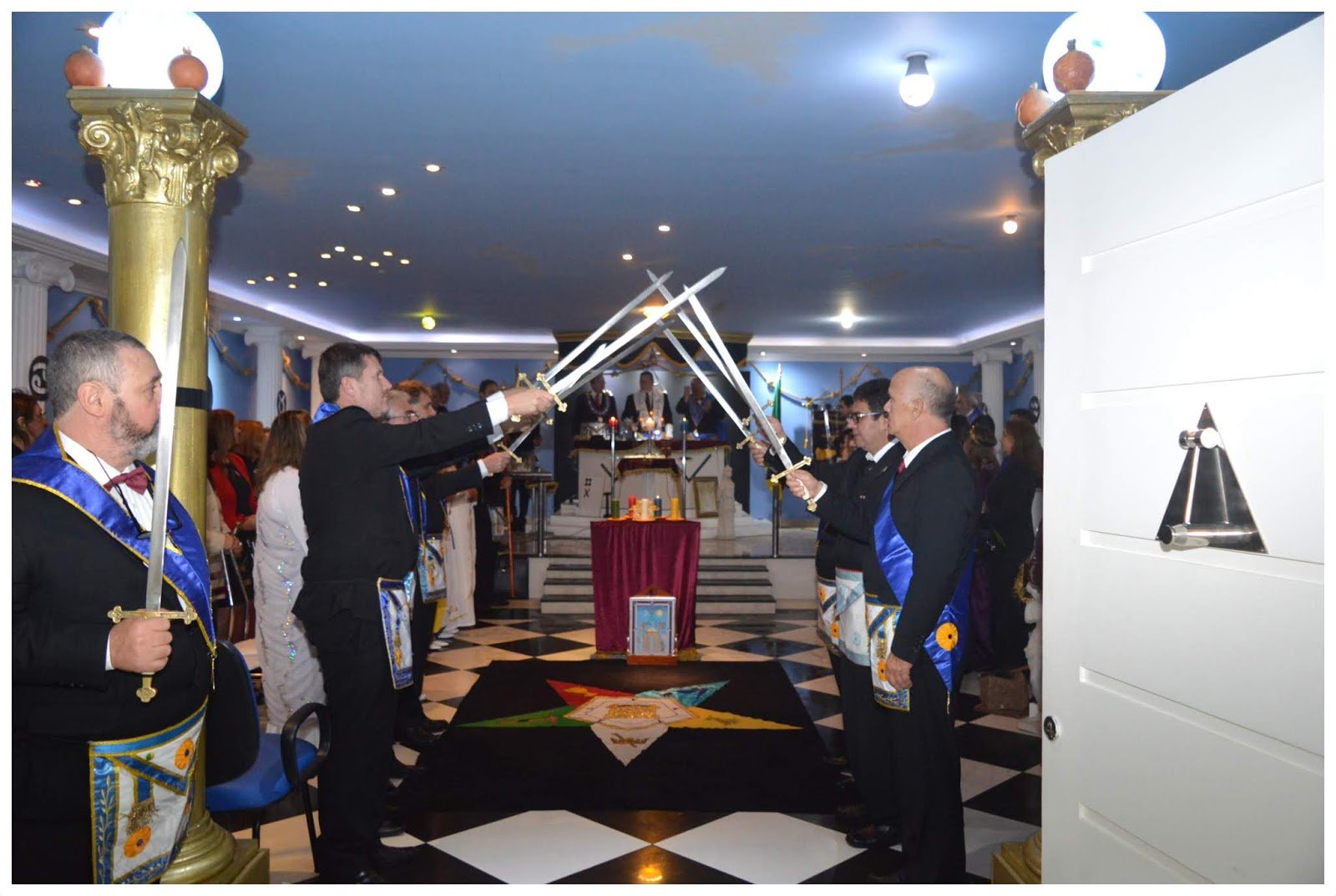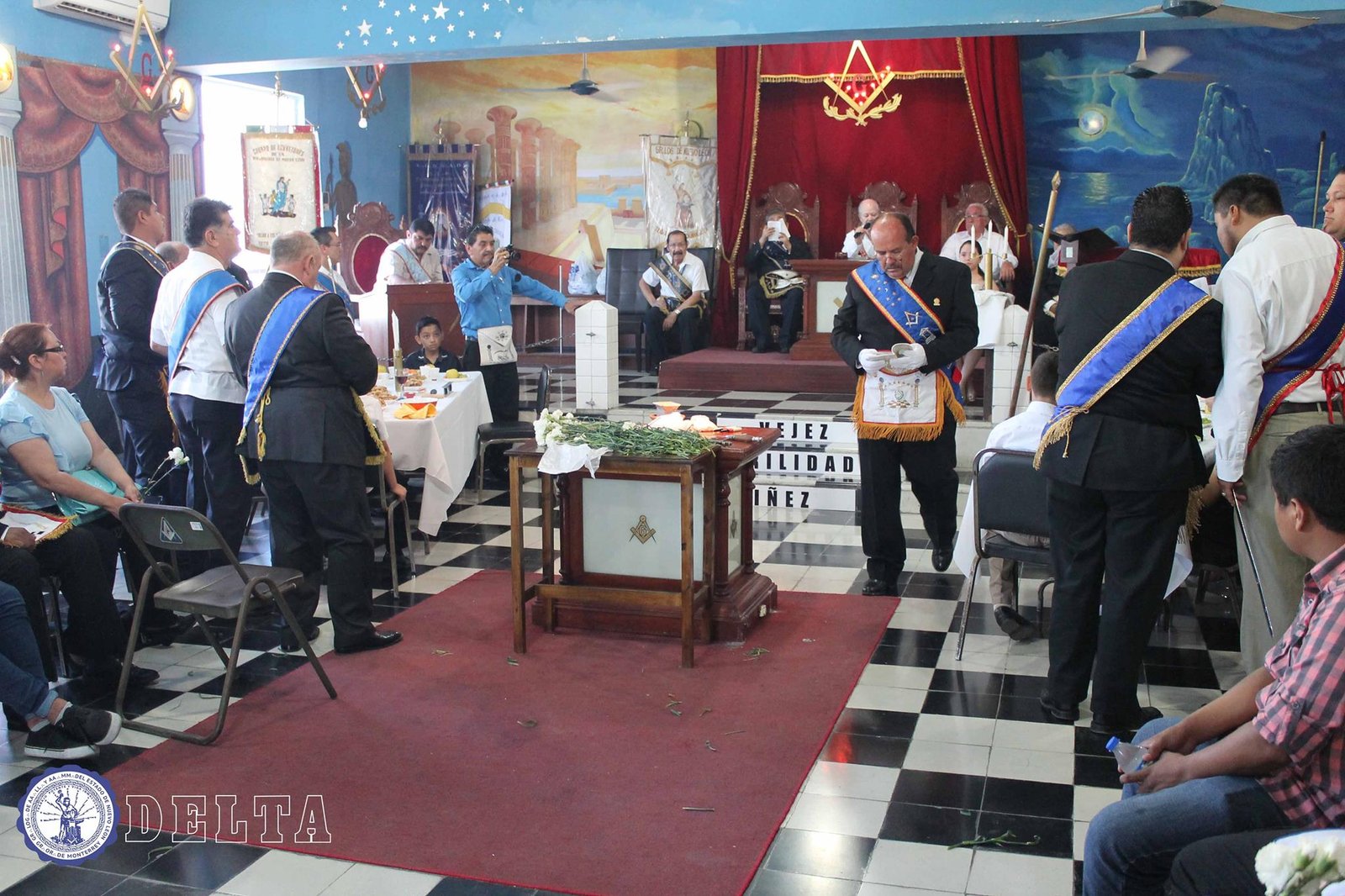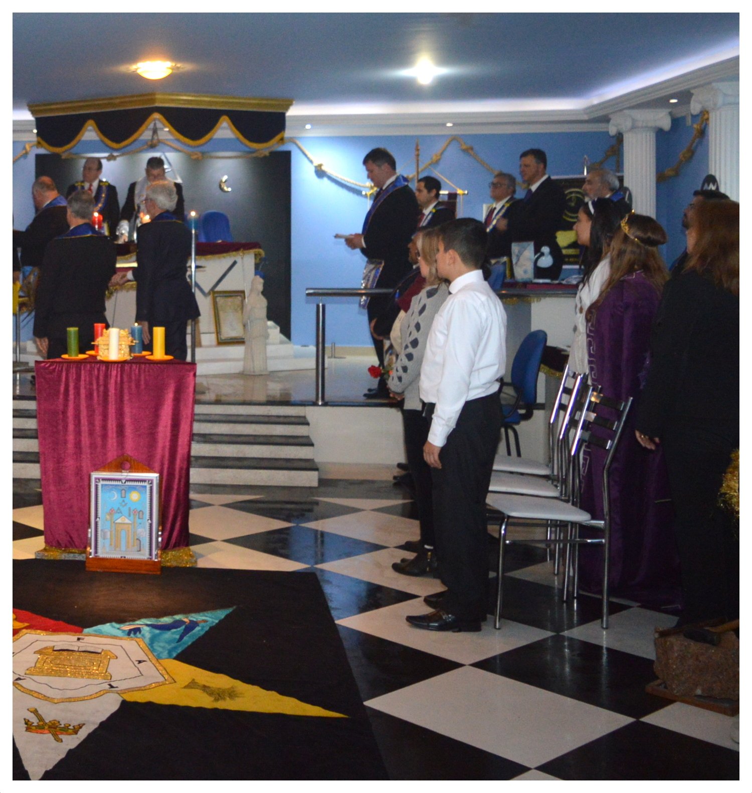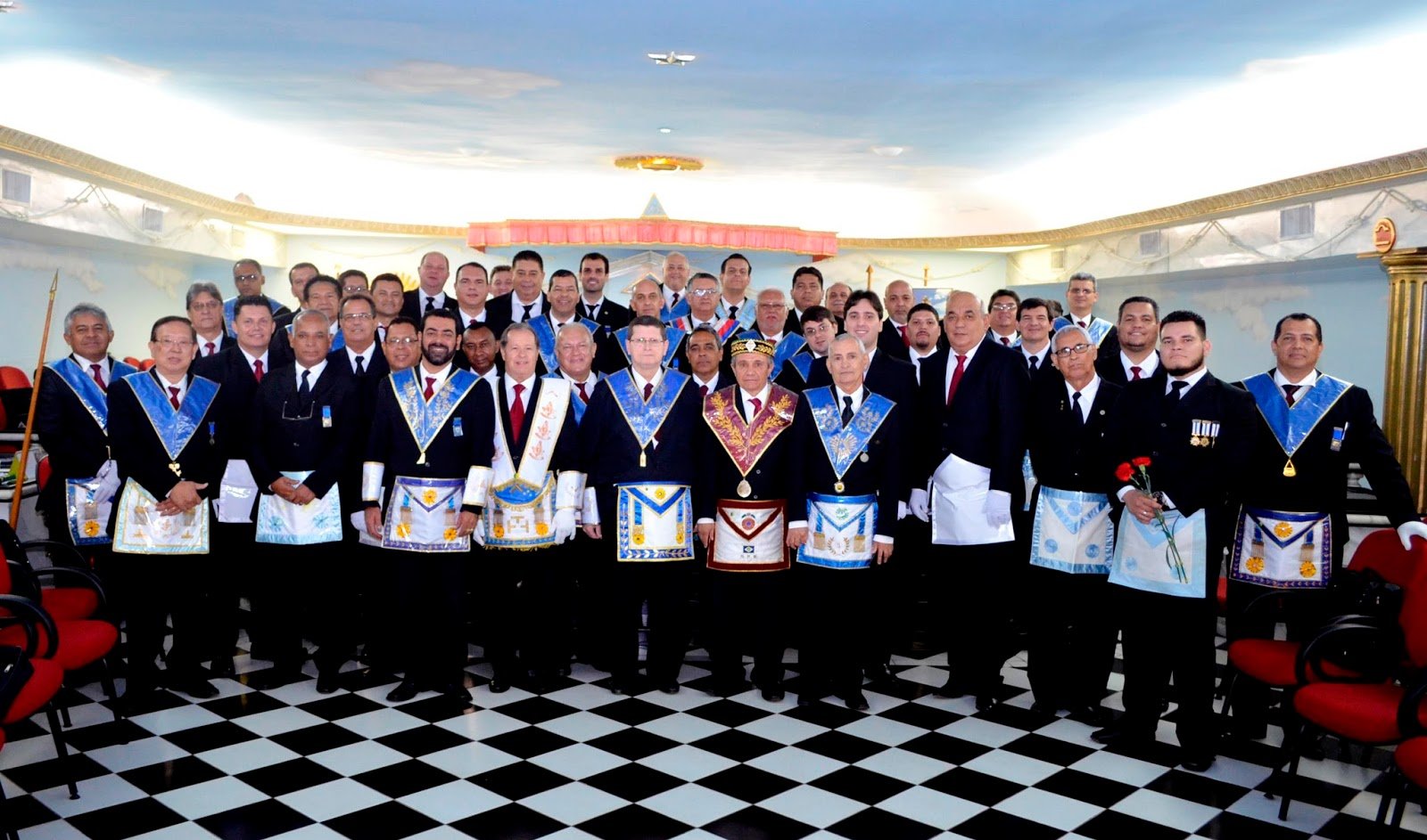 Nota: En las siguientes imágenes que verán del interior de las logias comprueben si ven alguna menorá o palabra del alfabeto hebreo decorando la sala