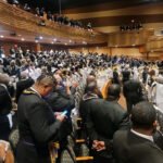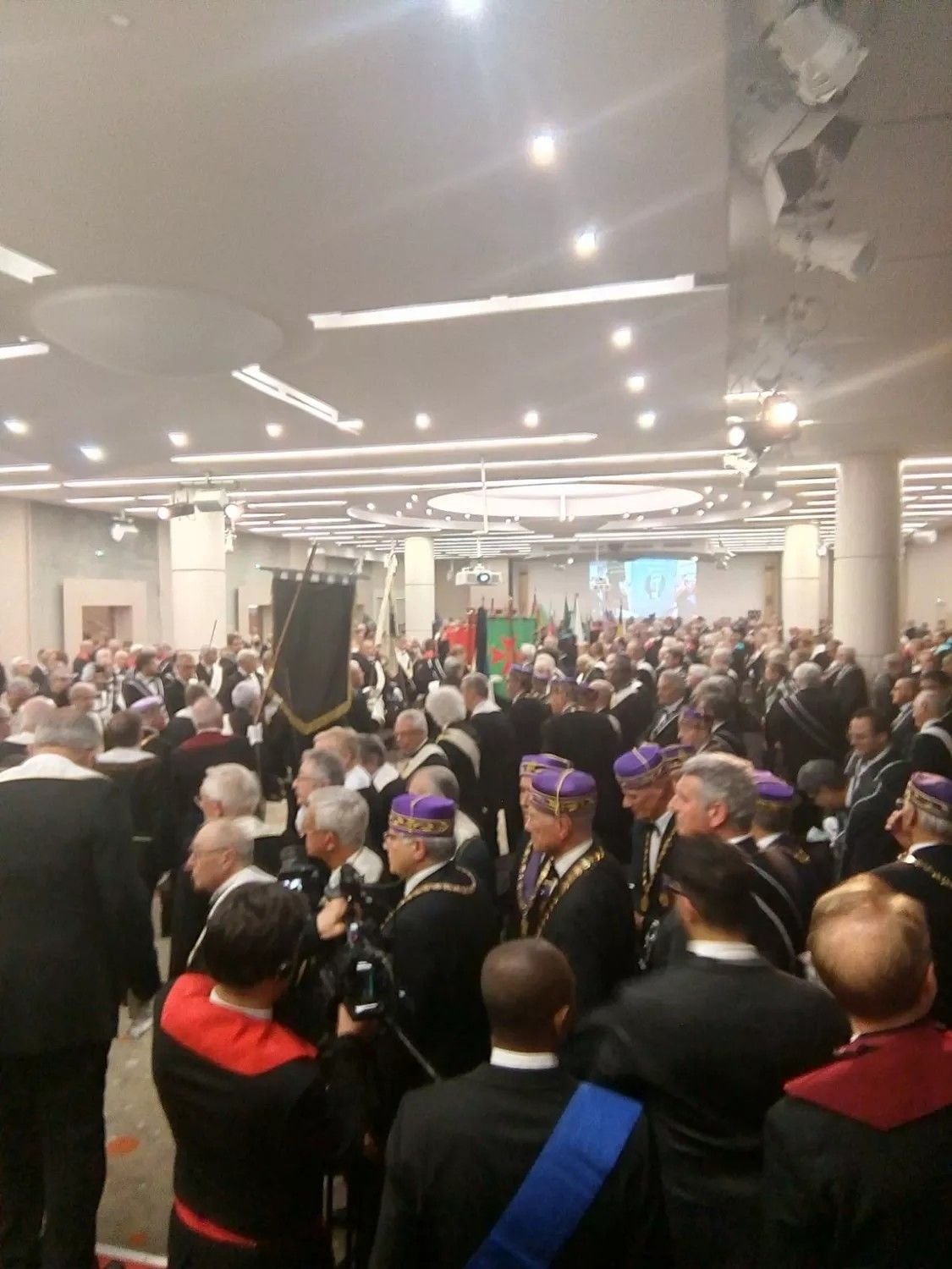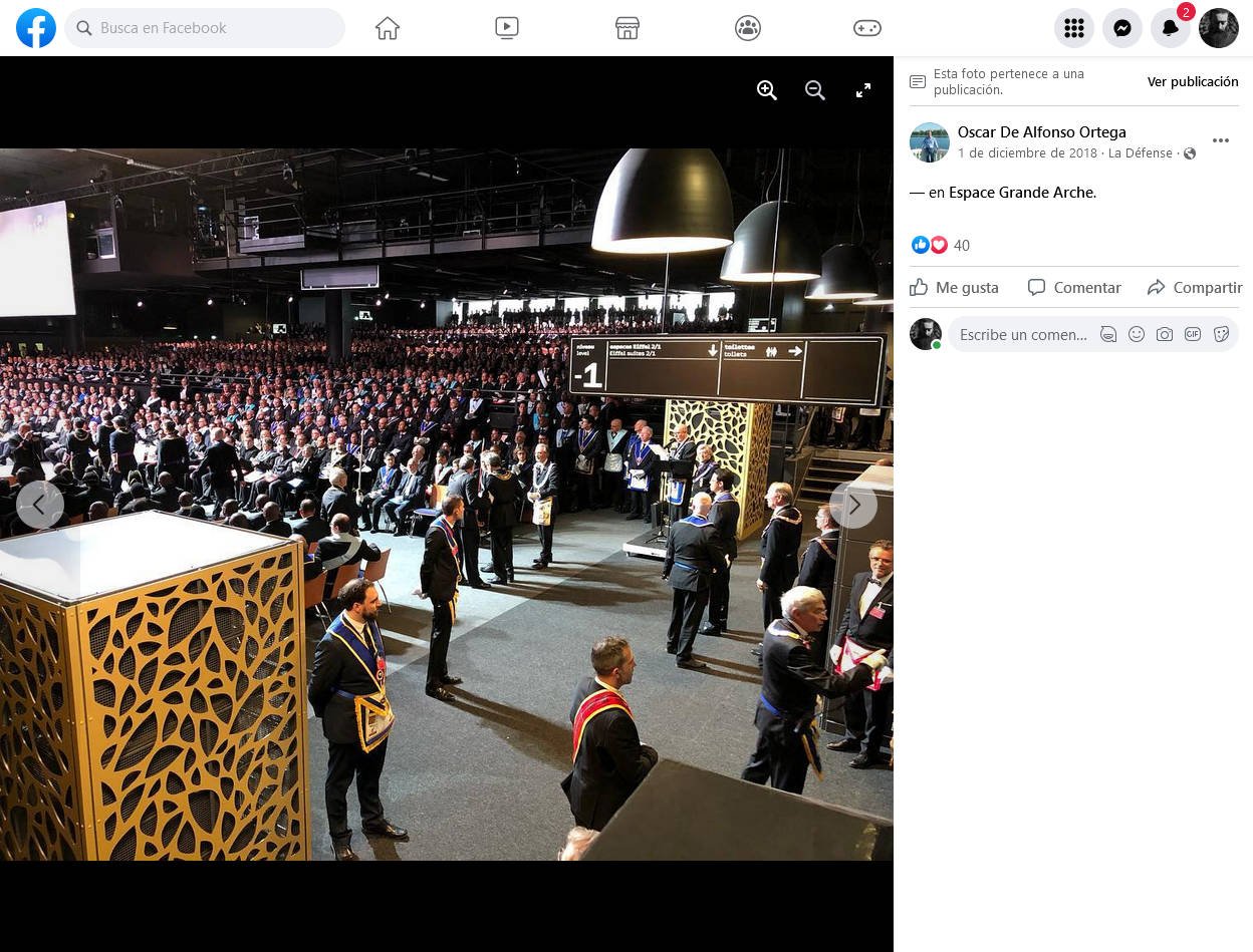 Tres imágenes. Espace Grande Arche, París (2021). Oscar de Alfonso Ortega (GLE) en el Espace Grande Arche, París (2018). Y Comunicación anual de la Gran Logia de Francia en París, 2022.