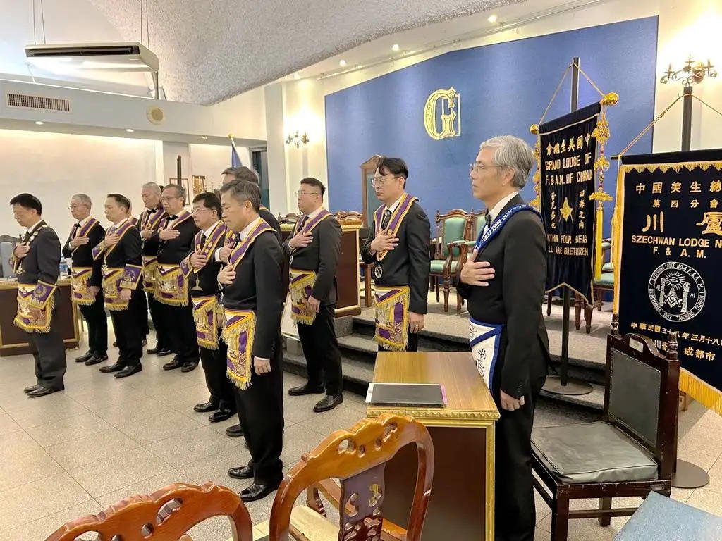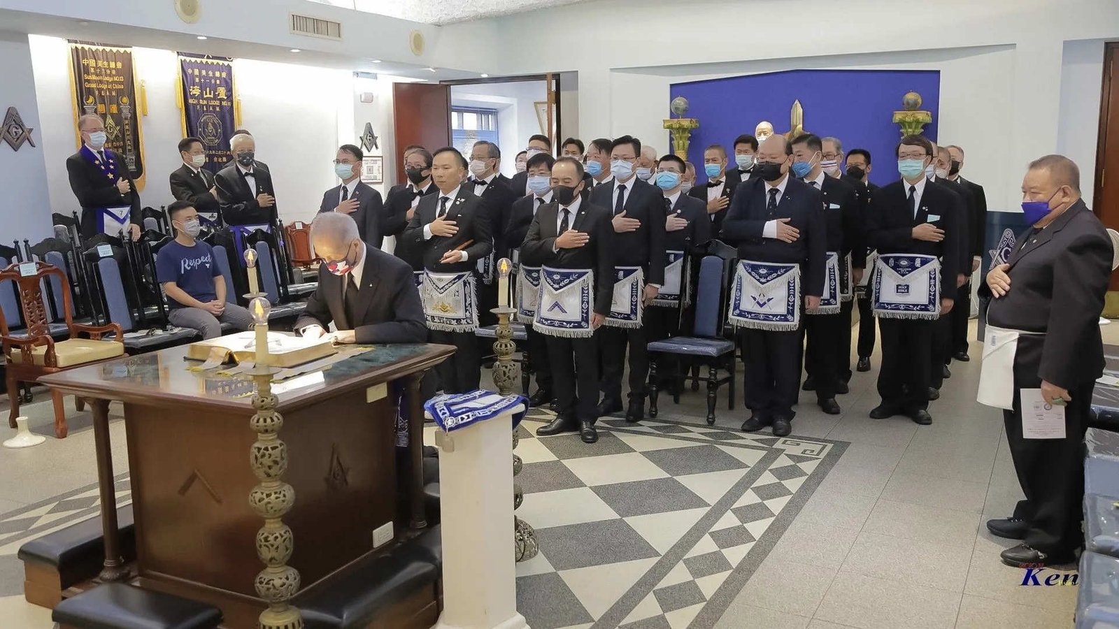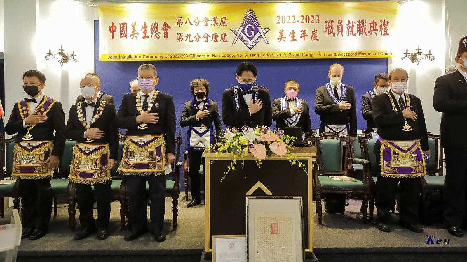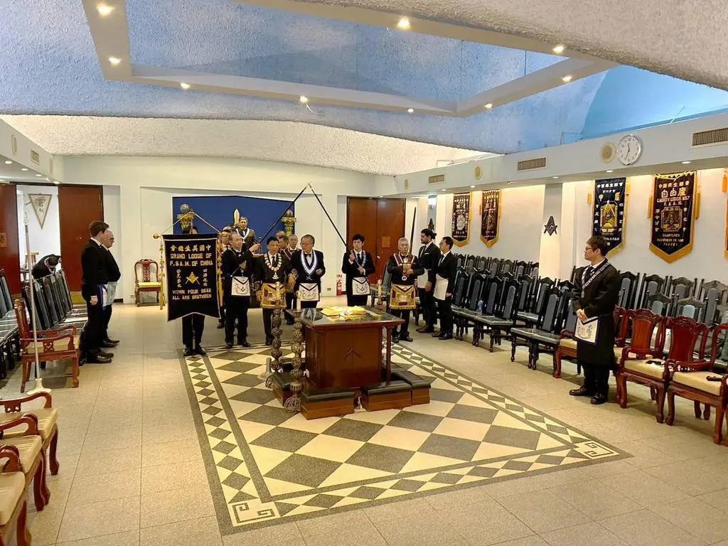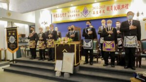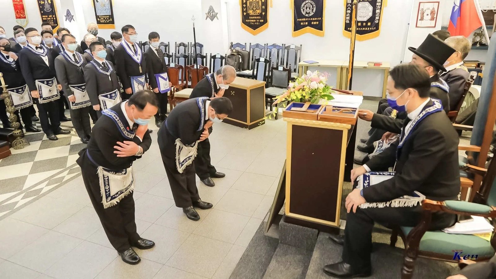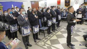 Desde la misma web de Taiwan es interesante la siguiente Instalación en la Logia Han No.8 y en la Logia Tang No.9. Usan mucho el Signo de Fidelidad masónica como expresión de obediencia a algo sentido y amado, la familia que conforman. La otra observación es que el cubo central, que habilitan como mesa, es el altar del templo masónico y es ahí donde se arrodillan.