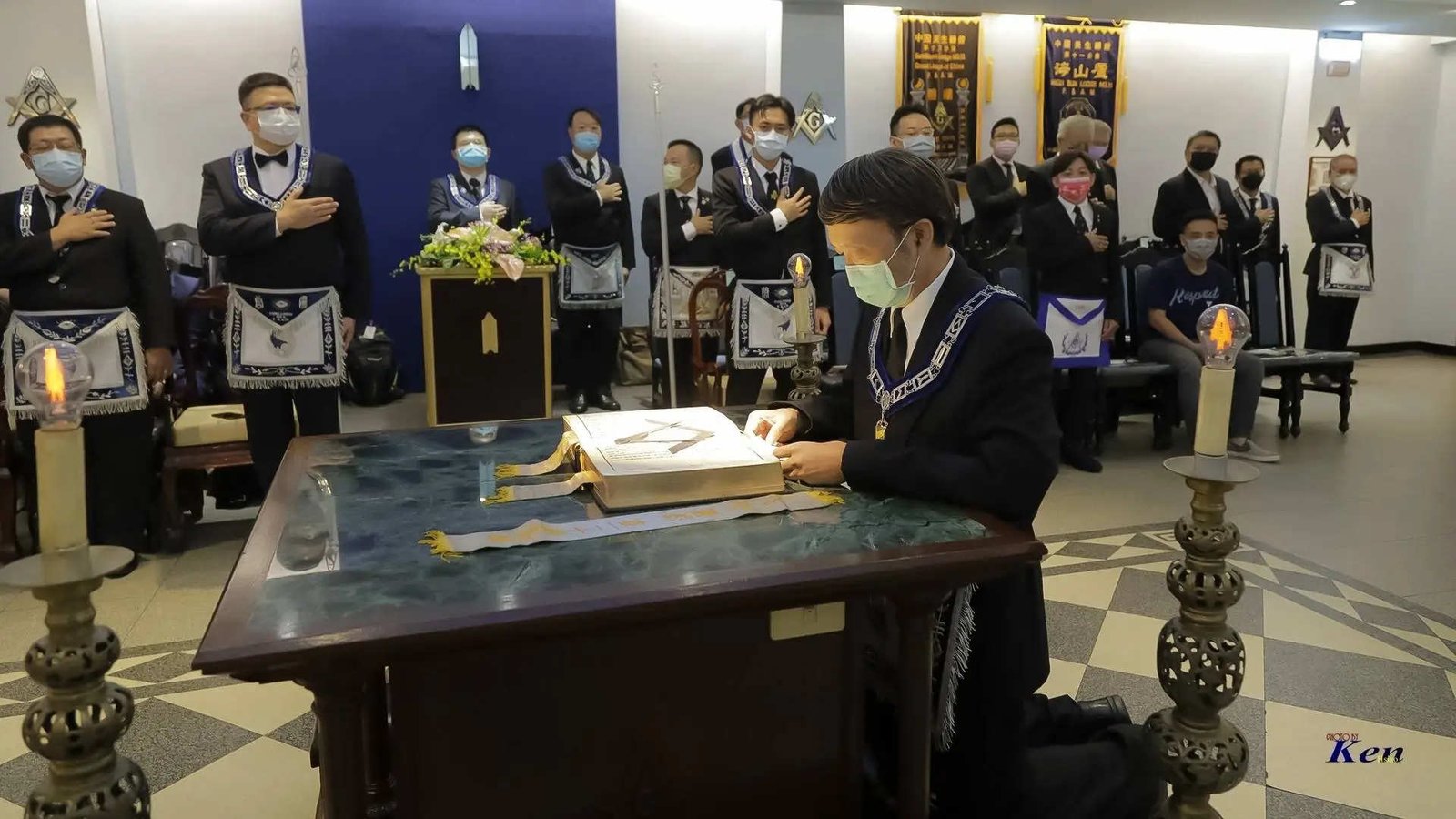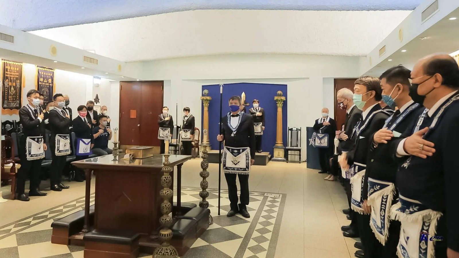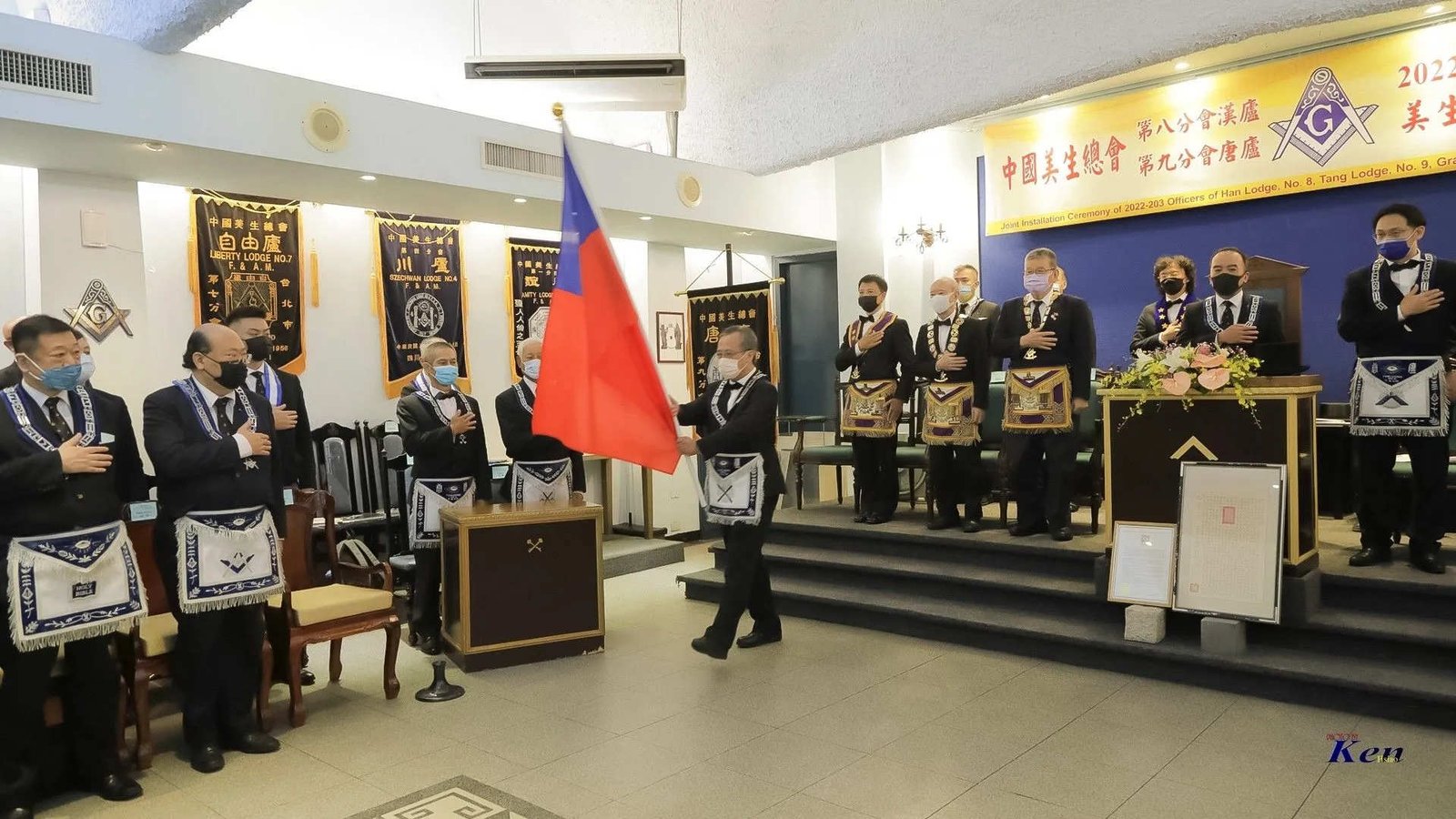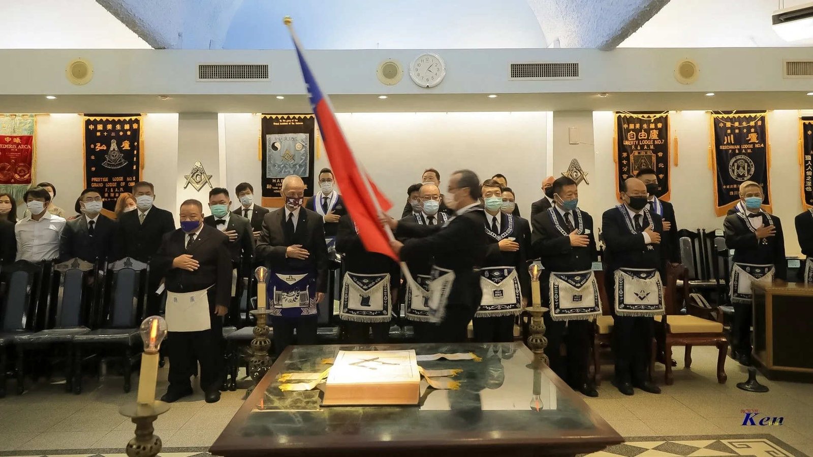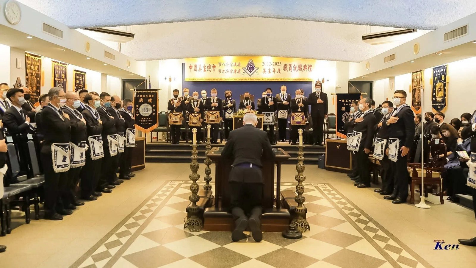 Desde la misma web de Taiwan es interesante la siguiente Instalación en la Logia Han No.8 y en la Logia Tang No.9. Usan mucho el Signo de Fidelidad masónica como expresión de obediencia a algo sentido y amado, la familia que conforman. La otra observación es que el cubo central, que habilitan como mesa, es el altar del templo masónico y es ahí donde se arrodillan.