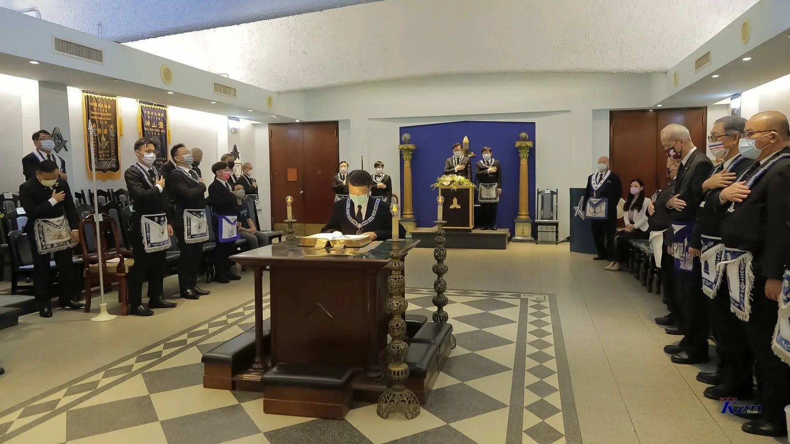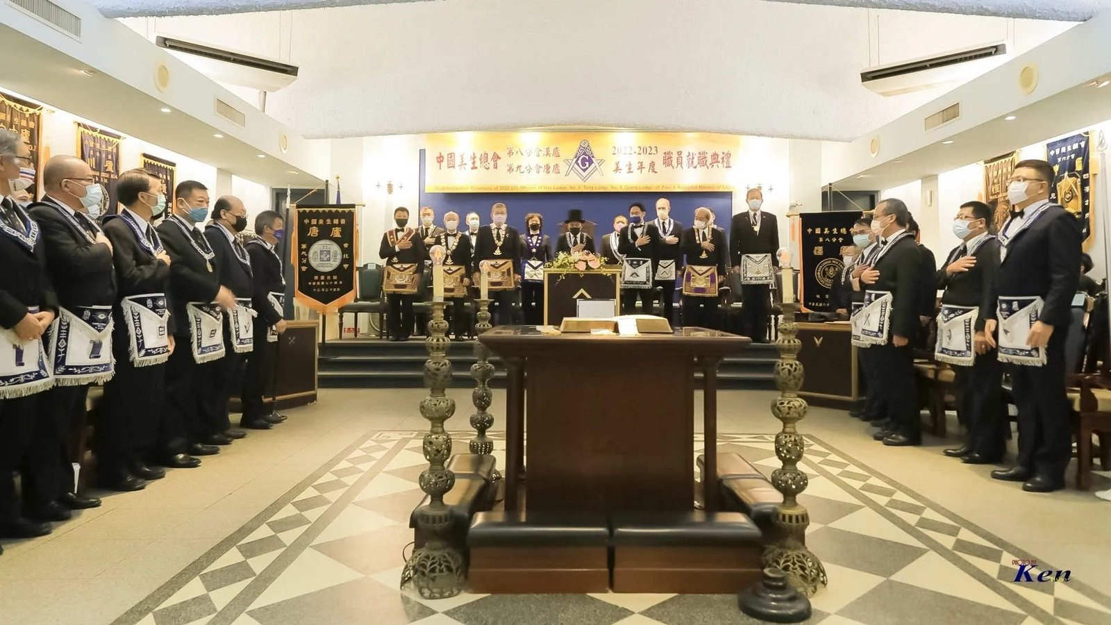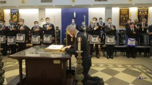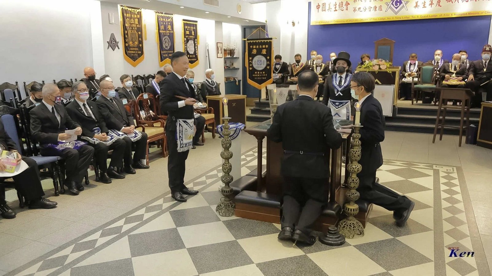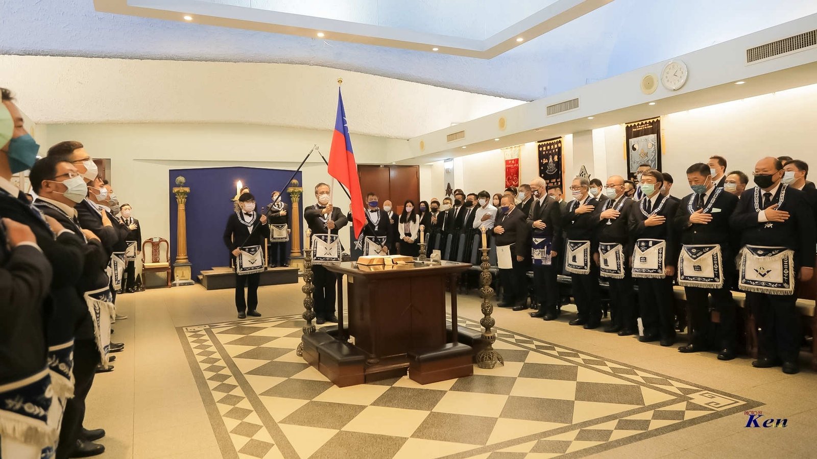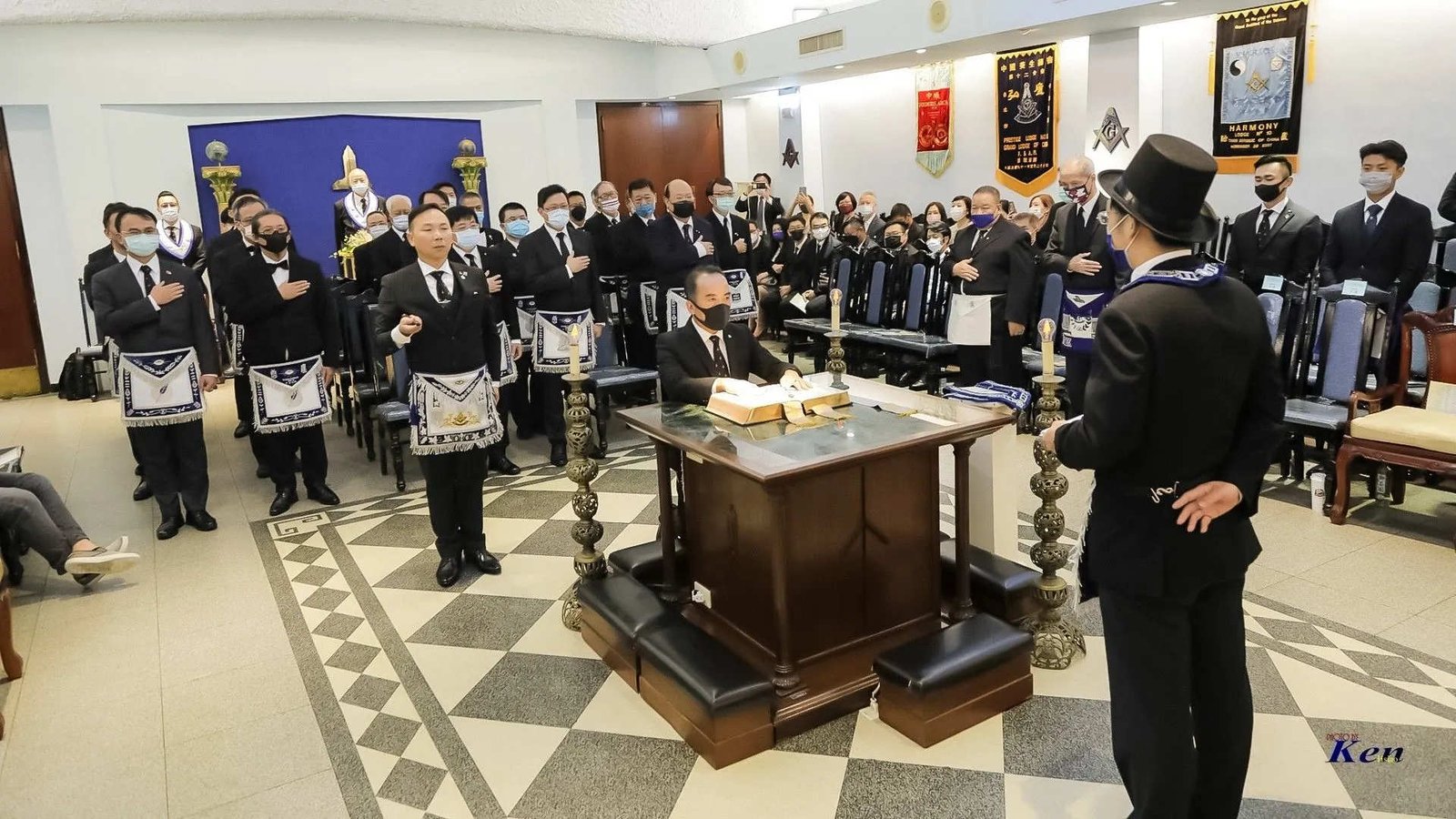 Desde la misma web de Taiwan es interesante la siguiente Instalación en la Logia Han No.8 y en la Logia Tang No.9. Usan mucho el Signo de Fidelidad masónica como expresión de obediencia a algo sentido y amado, la familia que conforman. La otra observación es que el cubo central, que habilitan como mesa, es el altar del templo masónico y es ahí donde se arrodillan.