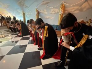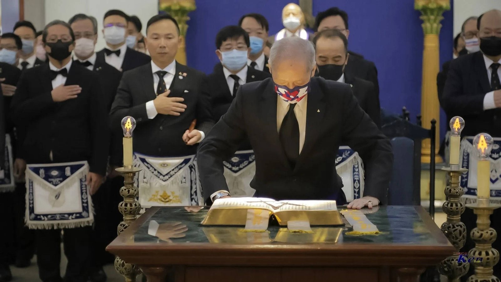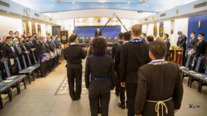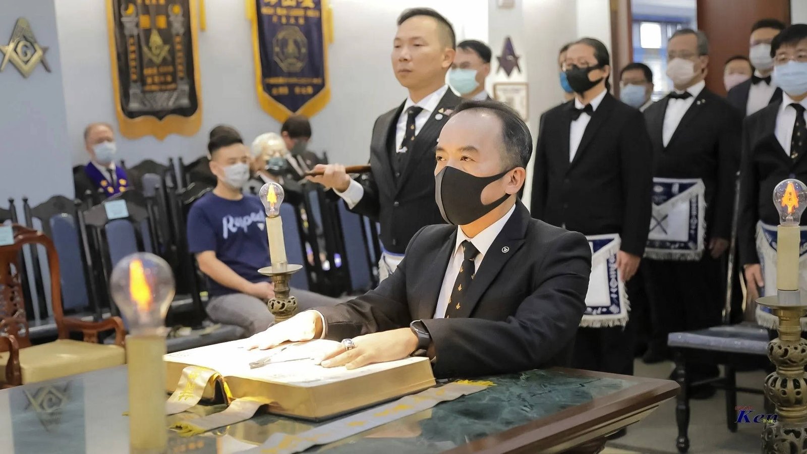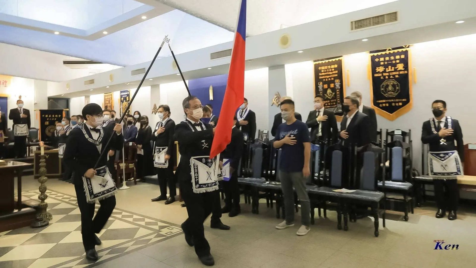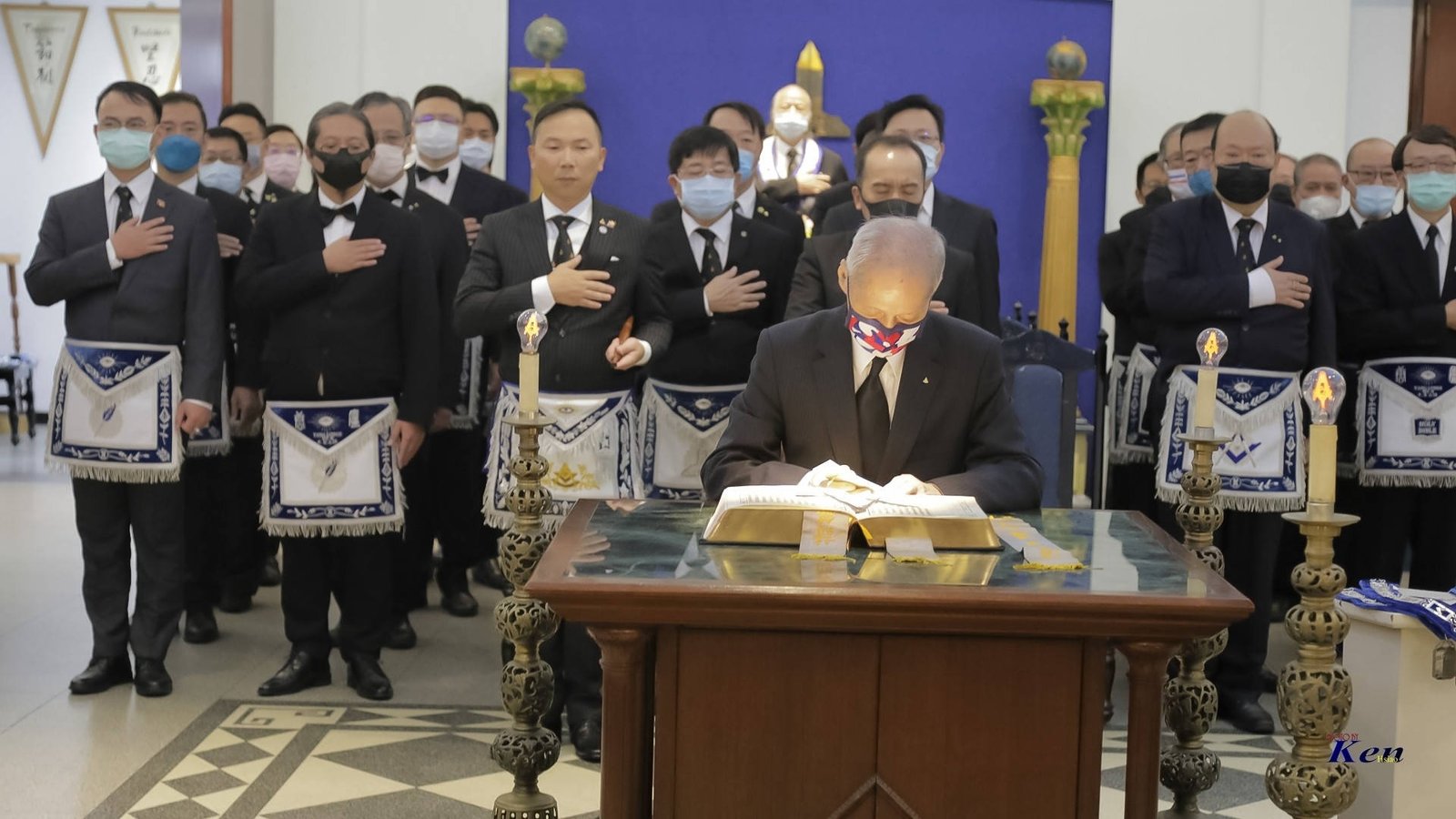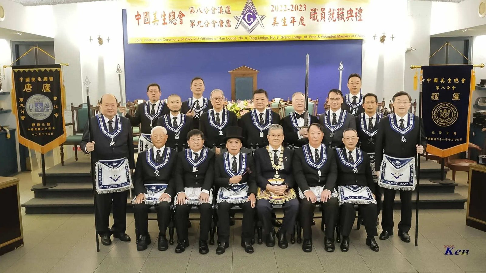 Desde la misma web de Taiwan es interesante la siguiente Instalación en la Logia Han No.8 y en la Logia Tang No.9. Usan mucho el Signo de Fidelidad masónica como expresión de obediencia a algo sentido y amado, la familia que conforman. La otra observación es que el cubo central, que habilitan como mesa, es el altar del templo masónico y es ahí donde se arrodillan.