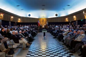 La siguiente imagen es una pintura del Salón Conmemorativo del «George Washington Masonic National Memorial» en Alexandria, Virginia (EEUU), a las afueras de Washington, D.C.